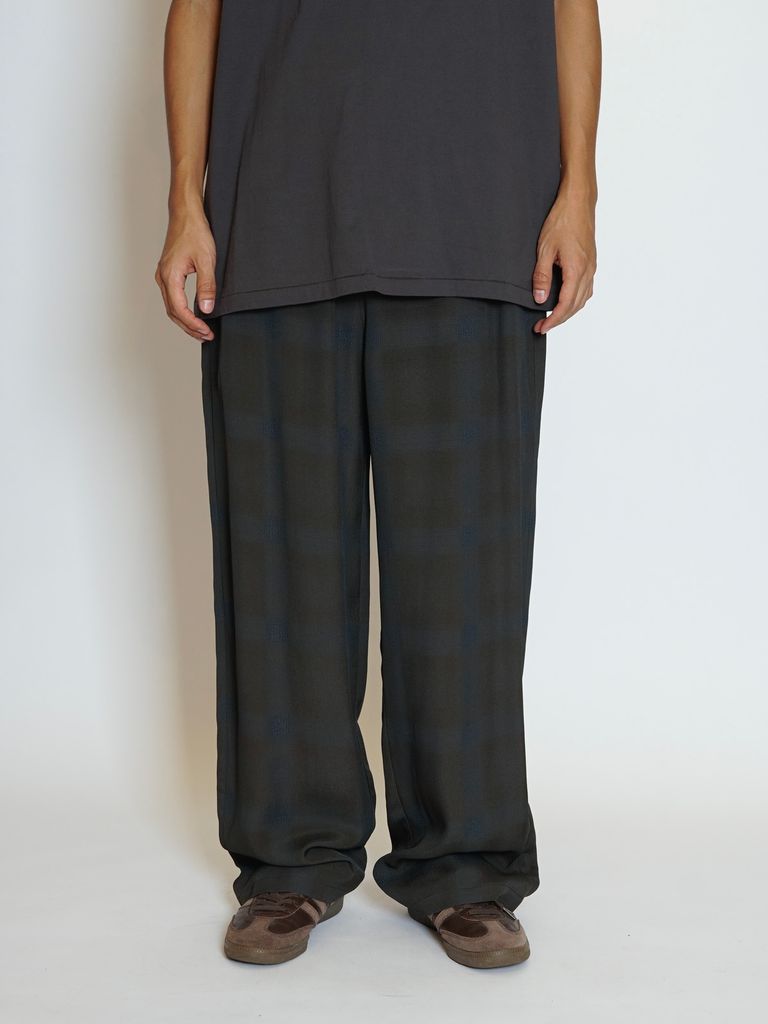 オリジナルで作成したアセテートとレーヨン素材を使った非常に落ち感のあるチェックを使用したラウンジパンツ。